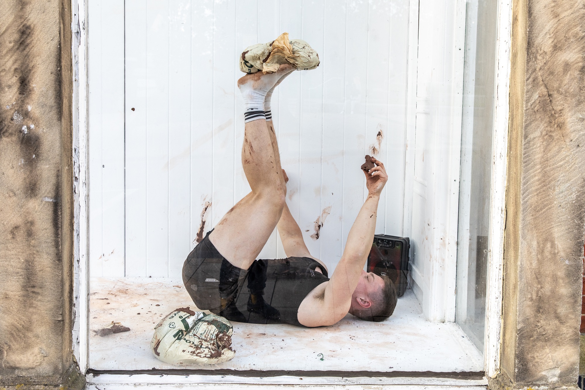 Artist Statement – Jake is a Medway artist. His practice is concerned with debunking the idea of fitness, work and exercise. He explores this by integrating his own use of the gym and physicality. This is articulated through performative, sculptural and installation-based works which use humour, tongue in cheek, and slapstick comical gestures. Wood also makes props for his performances. In addition, consider his practice inherently intrusive, where he intrudes into different kinds of zones and environments.